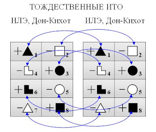 Так, например, ЭГО-творческий аспект инволюционной логики соотношений (-БЛ2илэ) – квестимной логики системных нормативов, структурирующий информационное поле аспекта эволюционной квестимной интуиции потенциальных возможностей – ЭГО-программного аспекта ИЛЭ, Дон-Кихота (+ЧИ1илэ/-БЛ2илэ), сообщает этой ЭГО-программе и этому информационному аспекту (+ЧИ) системные логические свойства, входящие в число программирующих его психологических признаков и проявляющиеся как в психологических характеристиках ИЛЭ, Дон-Кихота, так и во всех его интертипных отношениях.